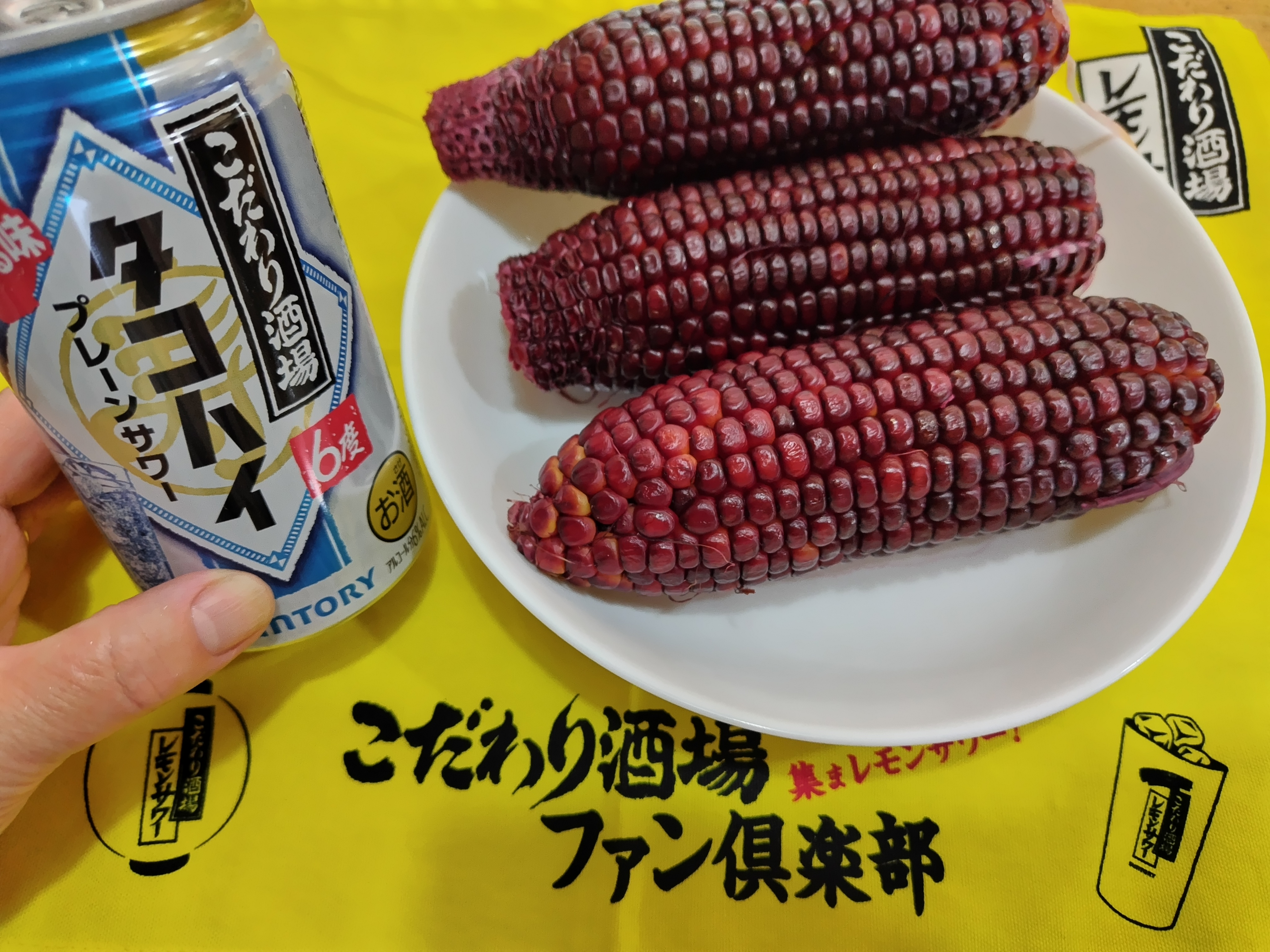直売所で見つけたモロコシ🌽赤色と言うよりブドウ色💜なんと芯までバイオレット😈食べたら指先も染まりました〜🥂タコハイでデリシャス乾杯