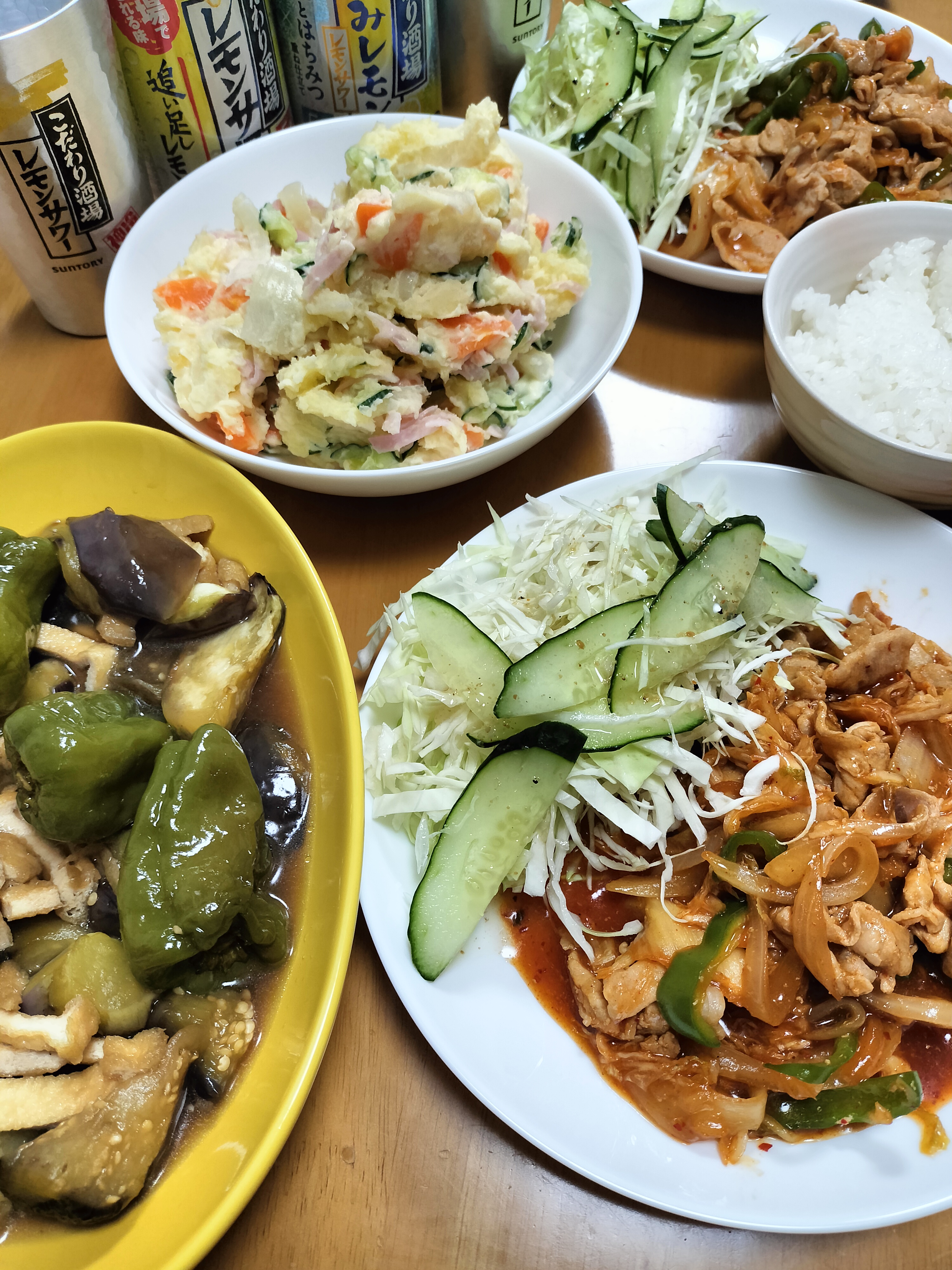 ライブ見たあとにしみレモン発見!デザイナーさんの笑顔を思い出しながら飲んだよ👍今日は豚キムチになすとピーマンと油揚げ炊いたんとポテサラで😁